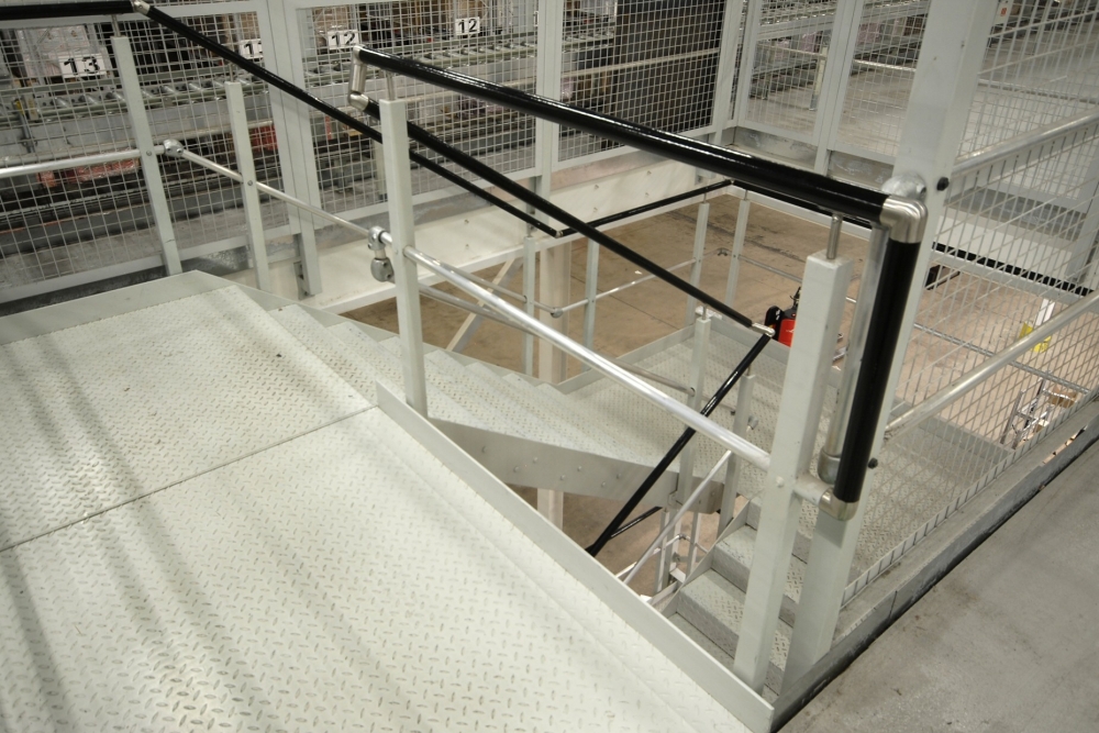 Die Lastenauslegung ist bei jeder Stahlbaubühne von zentraler Bedeutung; für dieses Projekt musste die Konstruktion für die schwere Trägerlast der Regale ausgelegt sein, weshalb unter den Endrahmen der Regale Stahlträger für Lasten über 600 kg installiert wurden. (Dies ermöglichte außerdem eine völlige Freiheit bei der Ortswahl für leichtere Ausrüstung.)