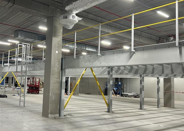 Insgesamt montierte MiTek über 32.000 m² Mezzaninfläche. „Auf neun Metern Höhe mussten wir Spiderkrane einsetzen – anders wäre das aufgrund von Gewicht und Raumhöhe nicht möglich gewesen“, so Nicholas. „Der logistische Aufwand war enorm.“