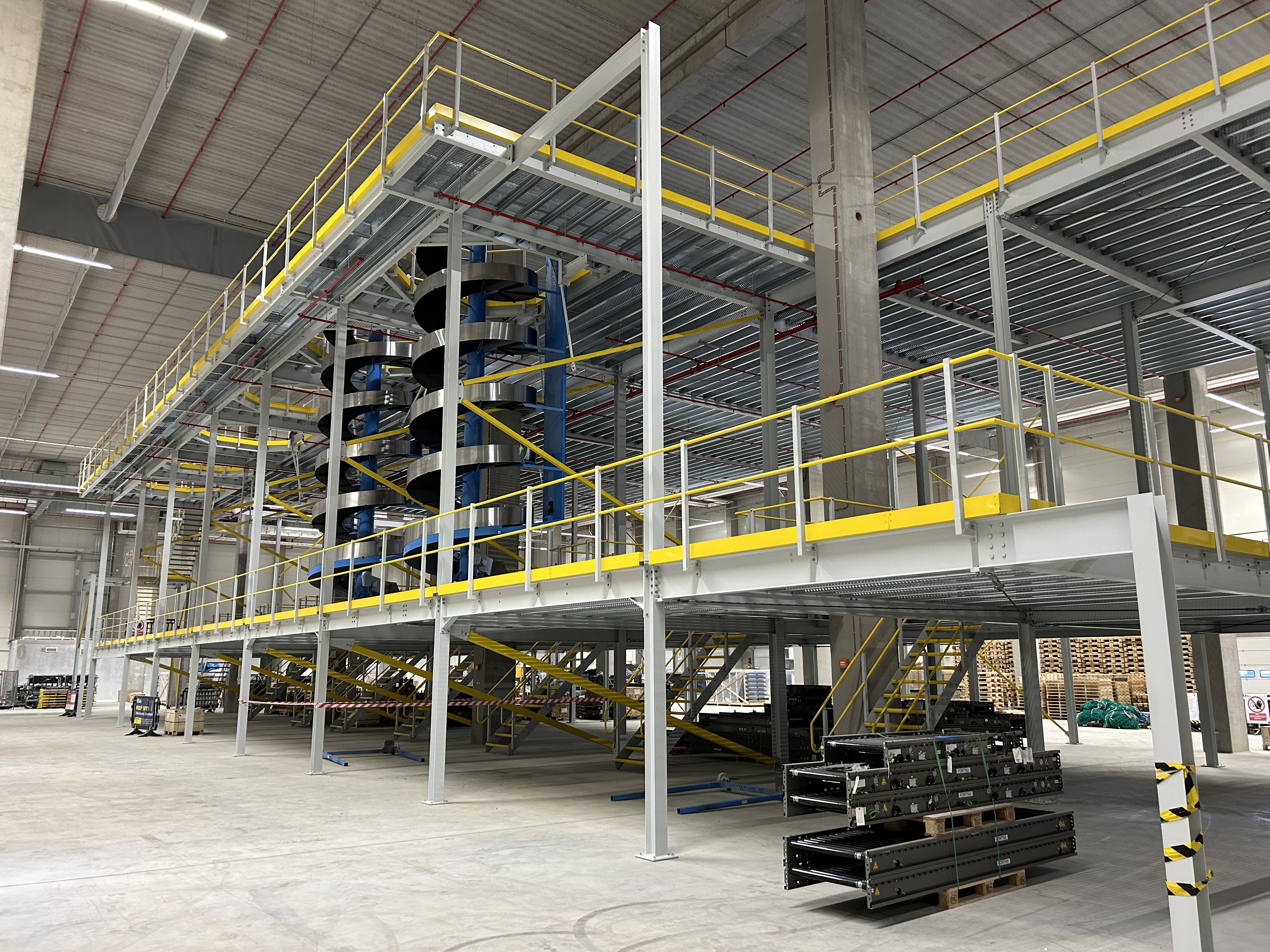 - Halle 4: Zweistöckiges Mezzanin für Förderlinien und Spiralförderer.